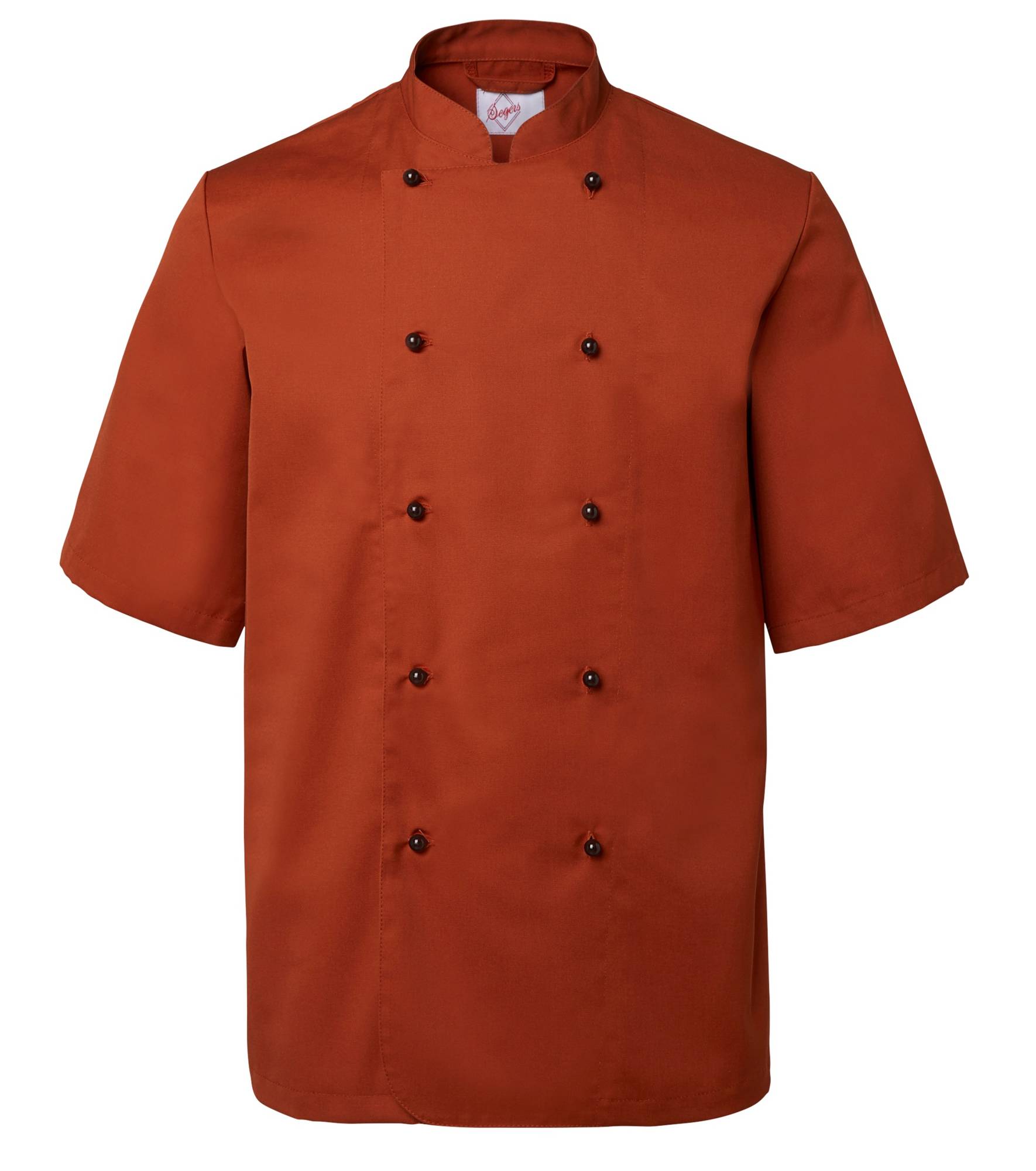 Lyhythihainen kokkitakki, suora malli, irroitettavat napit. Kynätasku vasemassa hihassa. Pesu 85°