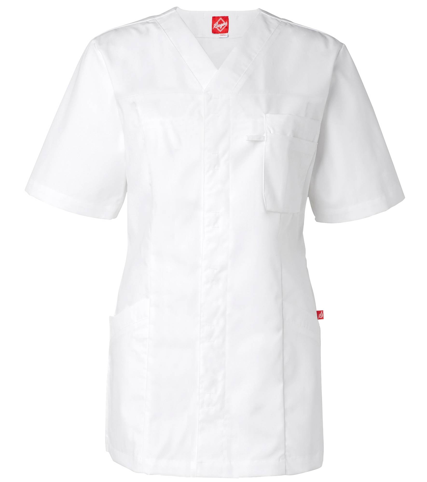 Istuva naisten takki sopii loistavasti hoitoalan ammattilaisille. Paljon taskuja, nappikiinnitys, 50/50% puuvilla/polyesteri. Pesu 85°.