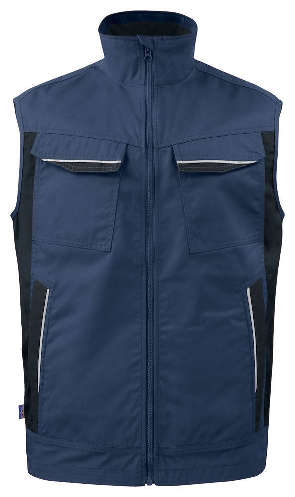 Mukava työliivi jossa on vetoketjulliset sivutaskut. Rintataskut ovat tarrakiinnityksellä, vasemmassa rintataskussa on D- rengas henkilökorttipidikkeelle. Kauluksessa on miellyttävä sisäpinta ja leukaa suojaava vetoketjunsuoja. Vasemmalla on myös sisätasku esim puhelimelle. Helma on takaa selkeästi pidempi joten se suojaa mukavasti selkää myös kumartuessa. Pienet heijastimet edessä ja takana. Niskassa on kätevä lenksu josta voit ripustaa liivin naulakkoon. Samaa liiviä löytyy myös toppauksella.